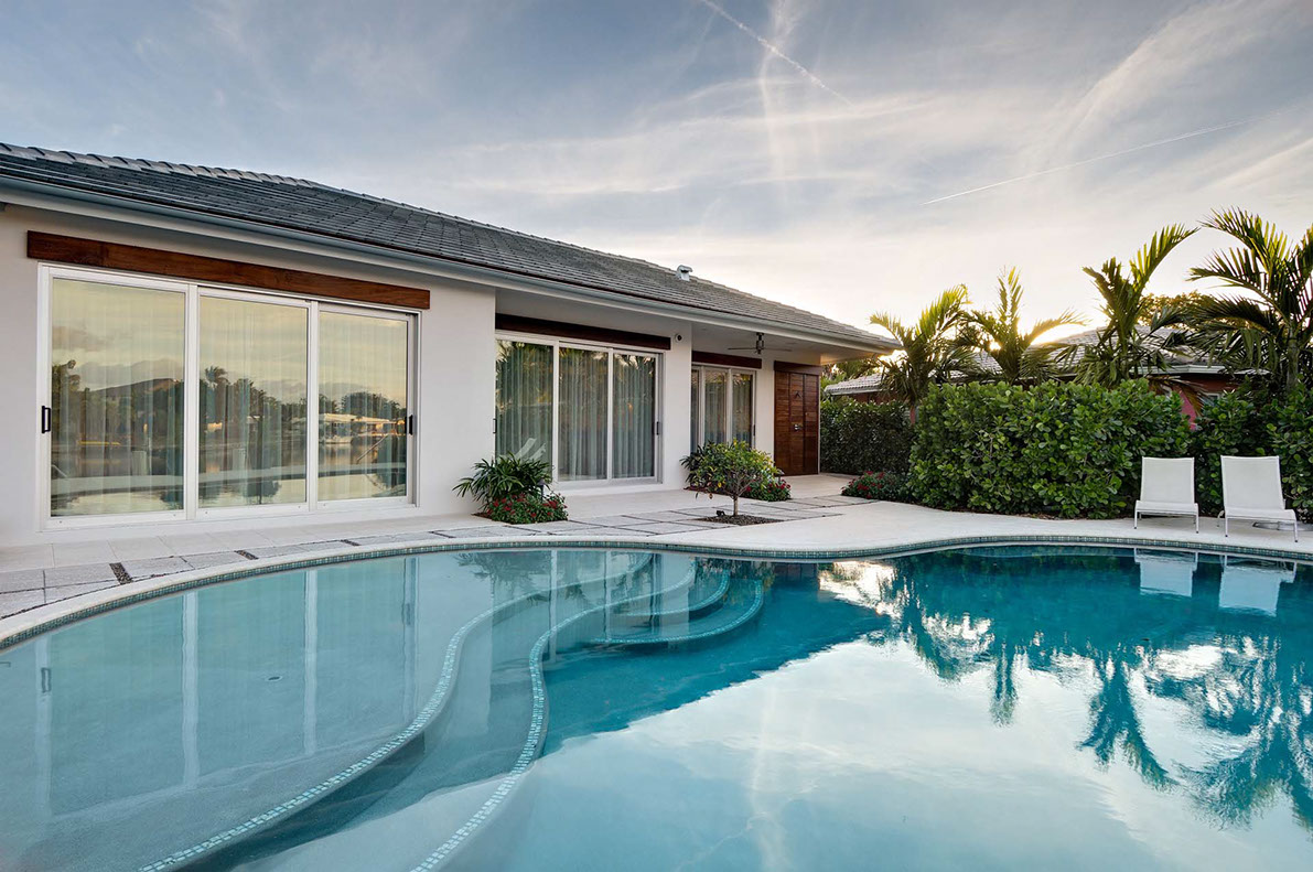 Long vistas down the South Fork of the Middle River drove the design of this home. Large amounts of glass toward the north guide your gaze from inside to pool terrace and beyond. On the south tall areas of glass line the entry and flood light to the center of the dwelling. A moderate palette of modern materials was applied including the selective use of tropical ipe wood to clad columns, detail windows and doors and an outdoor shower.