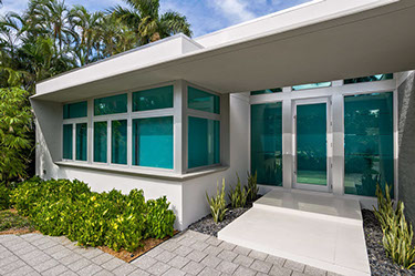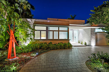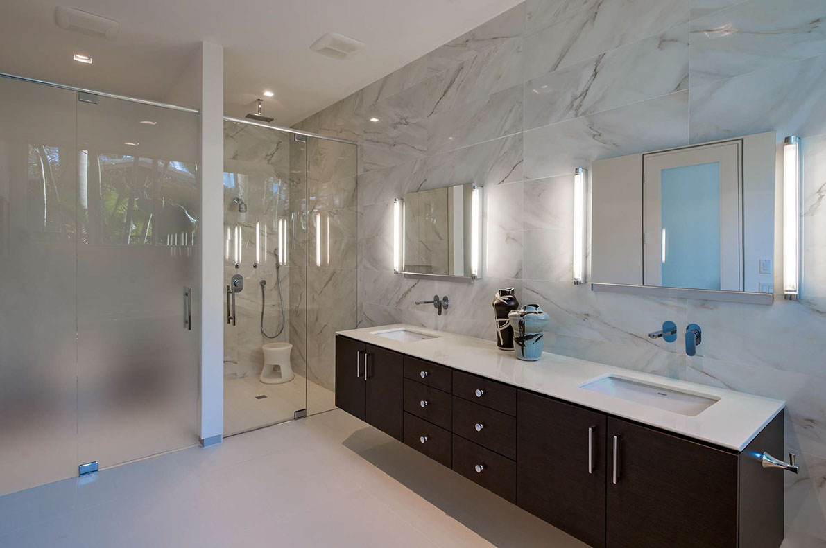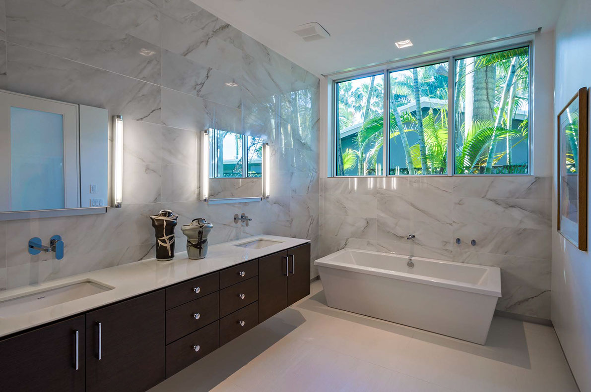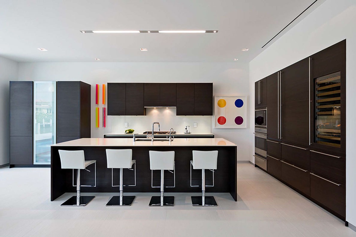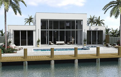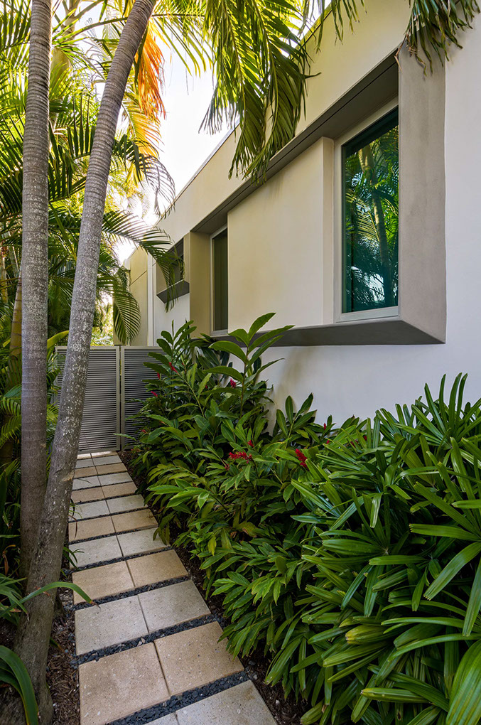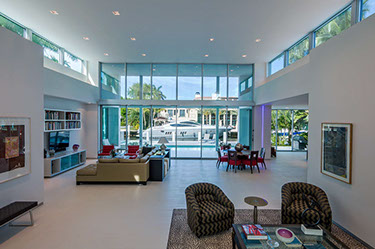 Impenitently modern, this home was envisioned to display distinguished modern art. Clerestory windows lining the center of the home spill indirect natural light into the center while a 28 foot moving wall of glass open to the layered view of loggia, pool terrace, dock and waterway beyond. Understated and unapparent consideration for sustainability were applied by tuning the size, location and orientation of windows and doors and overhangs to maximize daylighting without over heating the home in the subtropical sun.